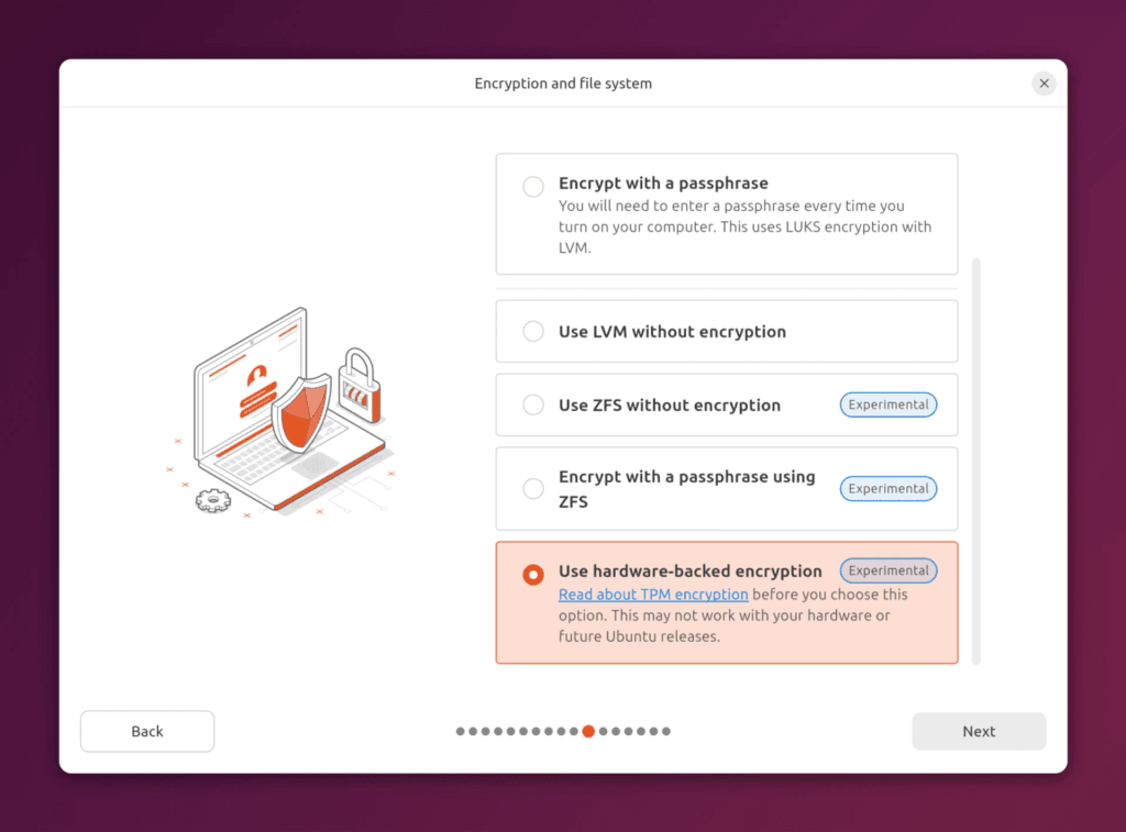 Esta versión ofrece soporte experimental para Full Disk Encryption (FDE) respaldado por TPM, proporcionando cifrado completo del contenido del disco y haciéndolo inaccesible en reposo. Las nuevas características incluyen: